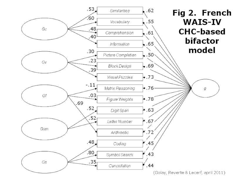 These preliminary results indicated that CHC-based interpretation of the French WAIS-IV is also a valid alternative. Furthermore, bifactor models showed better fit to the data than their higher-order counterparts. This challenges a rather implicit but nevertheless strong assumption that the relationship between the general factor and each subtest is only mediated by the broad abilities.
